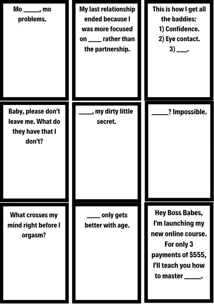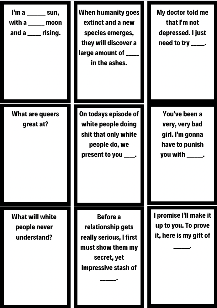 You can print it on normal printer paper or you can get it printed on thick cardstock at a local print shop. In total there will be 64 double-sided sheets. On average this would cost $7-30 on thick cardstock paper (depending on b&w or color) for a game you can enjoy for years. You can continue to reprint the blank black & white cards to continue adding unlimited prompts and answers to the game for more personalization.